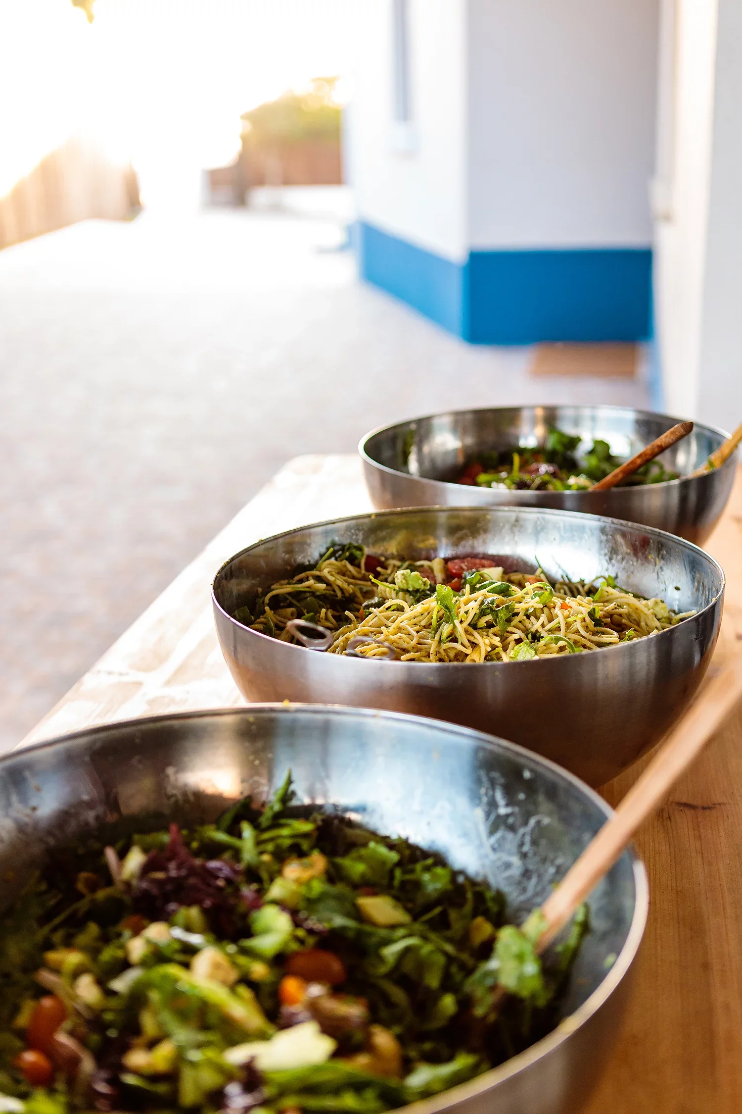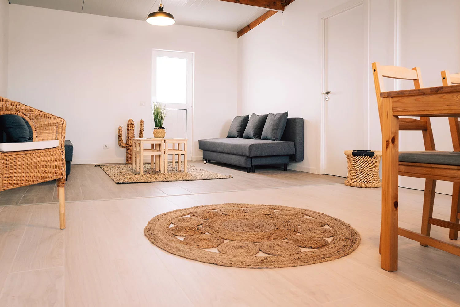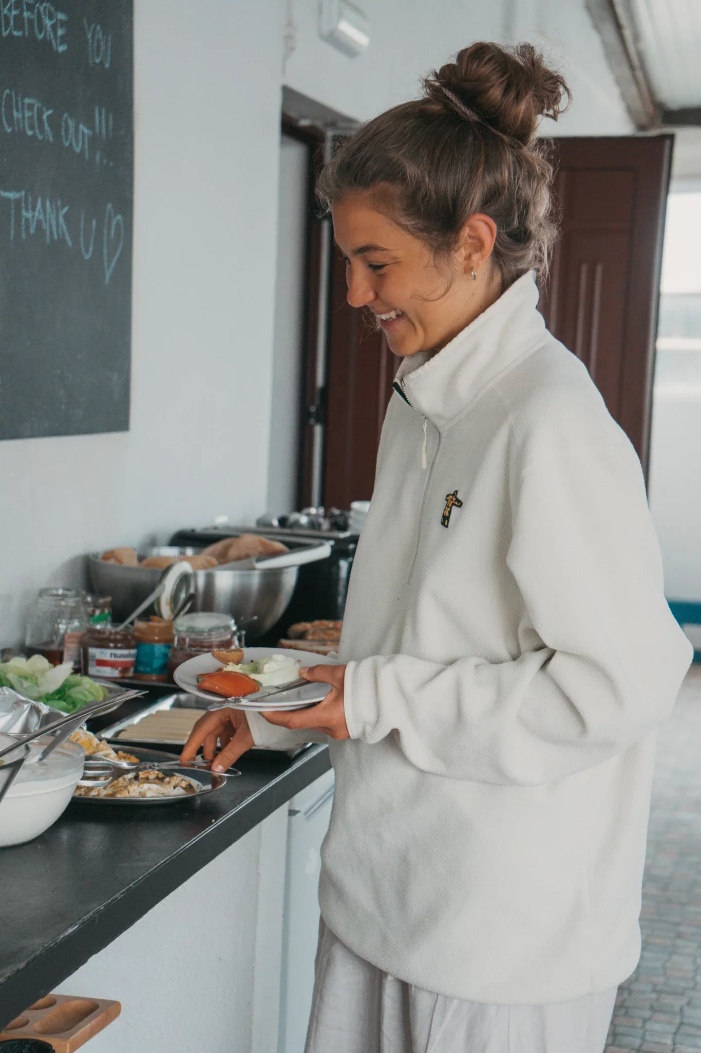 Zum Frühstück erwartet dich eine Auswahl an Obst, Müsli, Brötchen und erfrischenden Getränken. Abends (samstags bis dienstags) servieren wir bunte, lokal inspirierte Gerichte, die dir den Geschmack Portugals näherbringen. Die Halbpension ist bereits inkludiert bzw. bei der Family & Friends Suite verpflichtend buchbar (für 105 € p.P. pro Woche) und bietet dir die Wahl zwischen flexitarischer oder vegetarischer Verpflegung. Spezifische Unverträglichkeiten können wir leider nicht berücksichtigen. Für das Mittagessen gibt es am Strand kleine Restaurants und Cafés, die wir dir wärmstens empfehlen.