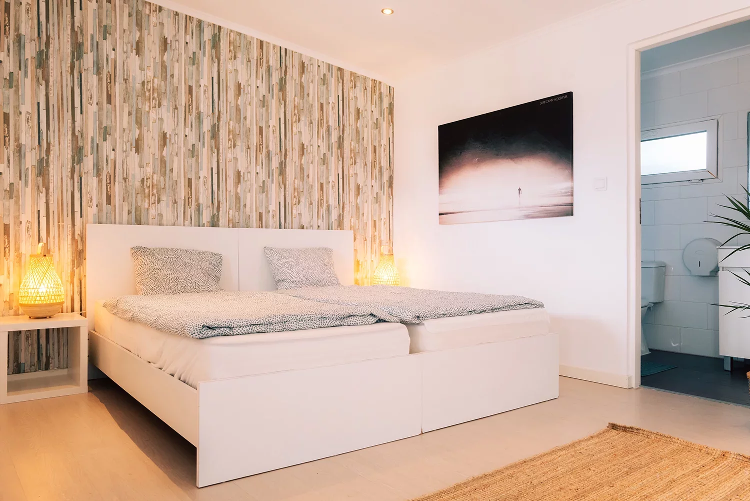 Unsere Freunde- und Familien-Suite gibt es in zwei Größen. Die kleine Suite (für bis zu 4 Personen) verfügt über zwei Queensize-Betten, ein Wohnzimmer und ein Bad. In der großen Suite (für 4-8 Personen) findet man ein Doppelzimmer, ein Zimmer mit 2 Stockbetten, ein Bad und ein Wohnzimmer mit Schlafcouch. Diese Suiten sind perfekt für Familien oder kleine Gruppen geeignet und bieten viel Komfort und Privatsphäre. Unser Surfhouse ist für Erwachsene (ab 18 Jahren) oder Familien mit Jugendlichen bzw. Kindern ab 13 Jahren ausgelegt.