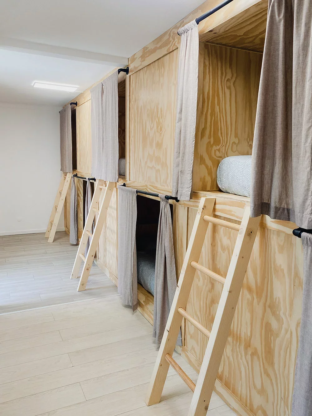 Im Surfhouse findest du insgesamt 3 geräumige Mehrbettzimmer. Zwei klassische Dorms für bis zu 4 bzw. 8 Personen, die mit Stockbetten ausgestattet sind und jeweils über ein Bad verfügen. Perfekt für kleine Gruppen oder um neue Leute kennenzulernen und echtes Reisefeeling zu erleben. Ein weiteres Mehrbettzimmer für bis zu 6 Personen ist mit modernen Sleeping Pods ausgestattet. Ideal für alle, die günstig reisen möchten, aber nicht auf Privatsphäre und Komfort verzichten wollen.