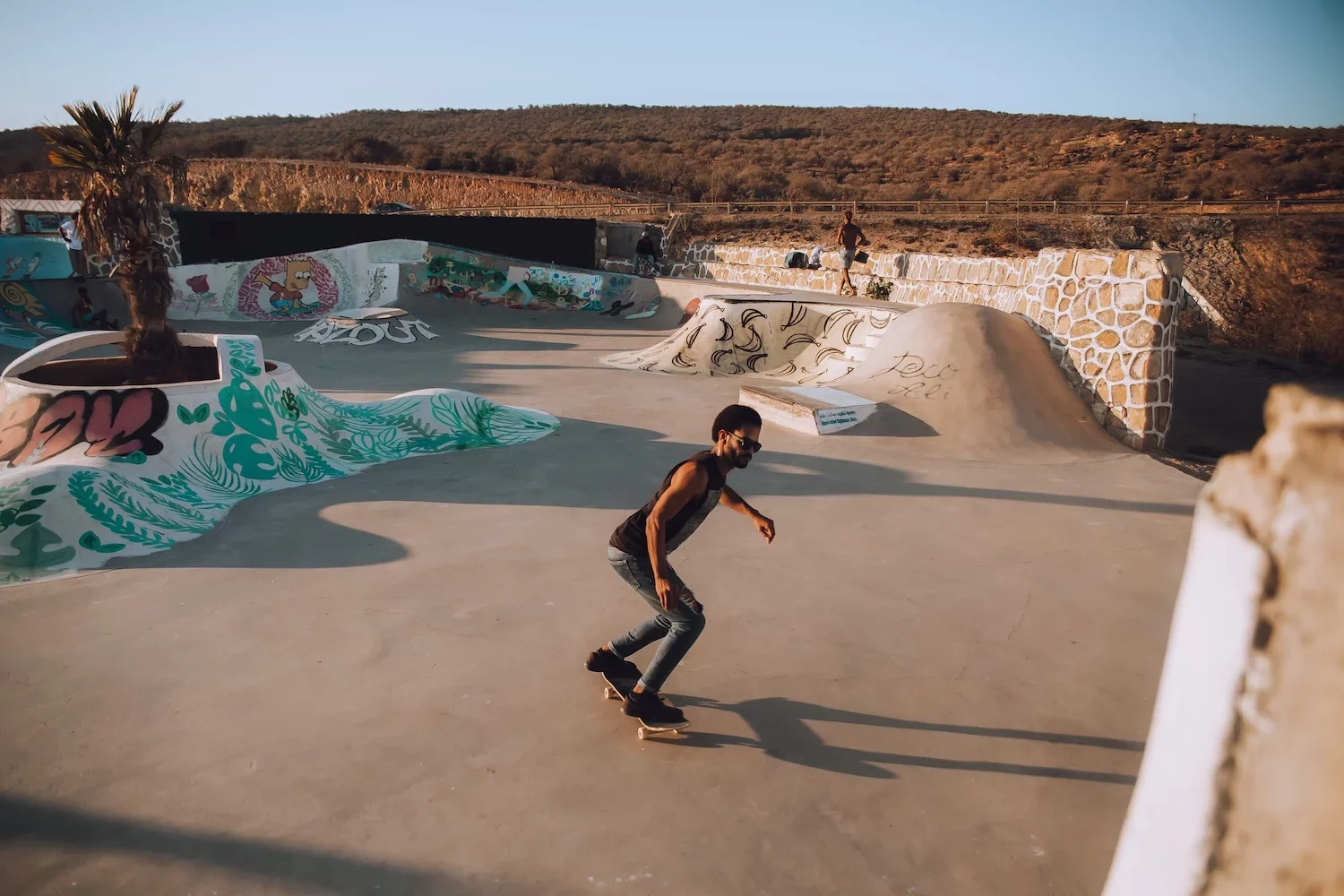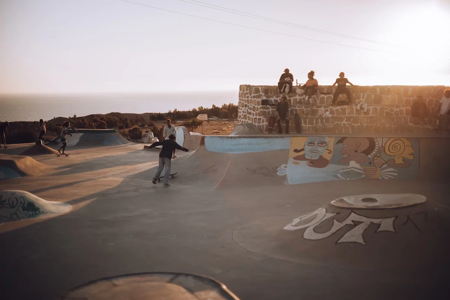 Der Skatepark in Taghazout ist ein echter Hotspot für alle, die Action und Ausblick kombinieren wollen. Hoch über der Küste gelegen, bietet er nicht nur ideale Bedingungen zum Skaten – mit Bowls, Rails und Rampen für jedes Level – sondern auch einen atemberaubenden Blick über den Atlantik, besonders bei Sonnenuntergang. Egal ob du selbst aufs Board steigst oder einfach die entspannte Atmosphäre genießen möchtest: Der Skatepark ist ein cooler Treffpunkt für Locals und Reisende, der Surf- und Skatekultur auf einzigartige Weise vereint.