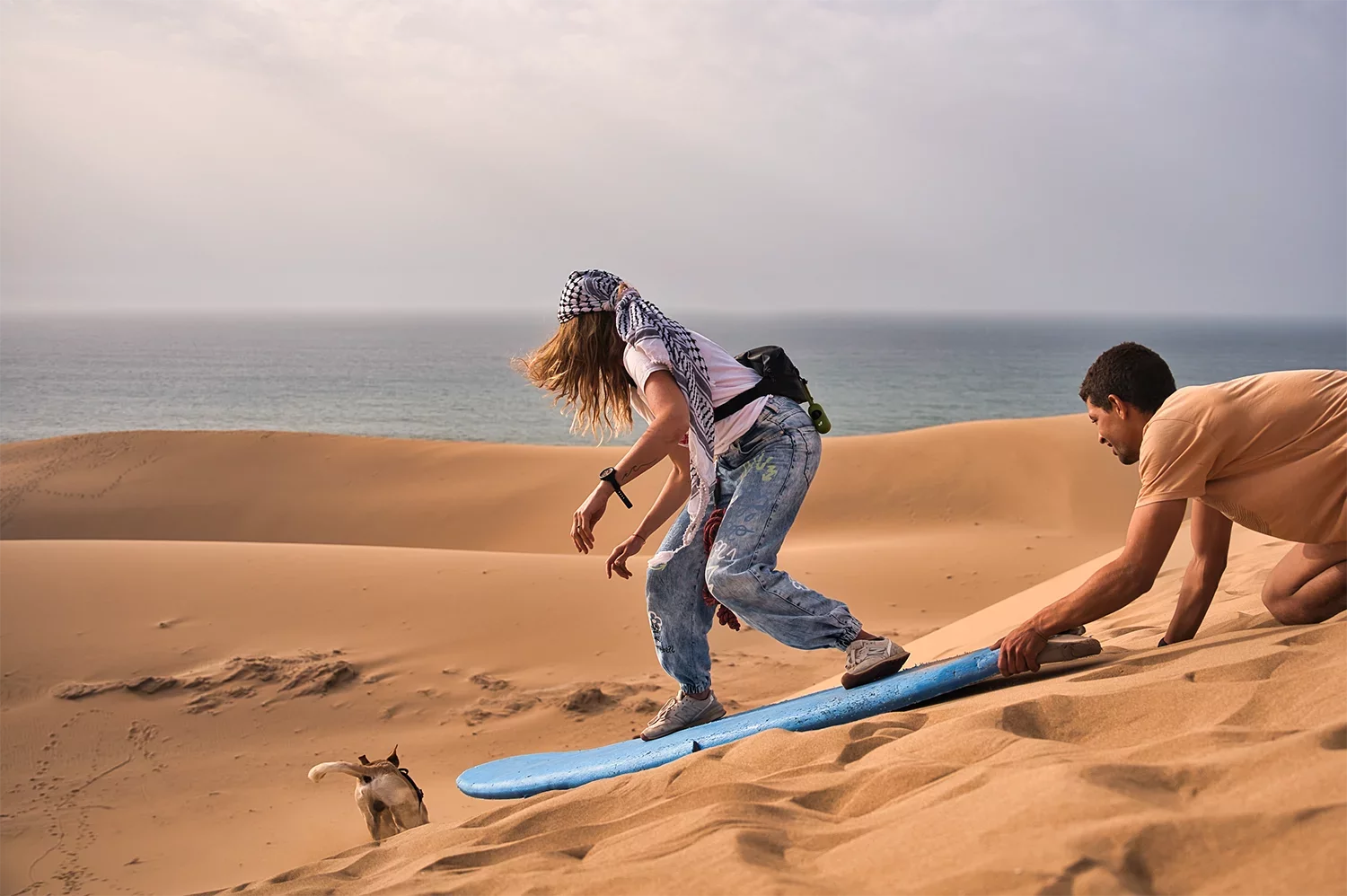Beim Sandboarding in der Wüste fährst du mit einem Board die hohen, goldenen Dünen hinunter, während der warme Sand unter dir durch die Luft wirbelt. Es ist ein aufregendes Abenteuer, das dir das Gefühl gibt, mit der Wüste eins zu werden und die Freiheit in der Weite der Landschaft zu spüren.