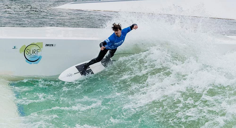 Falls ihr den Namen Lennard Weinhold zum ersten Mal hört solltet ihr euch diesen merken. Der gerade mal 18 Jährige ist ein Spezialist auf der stehenden Welle und nun offiziell Teamrider für Wavetours. 2019 hat Lenni bereits die boot Düsseldorf Wave Masters gewonnen. Er kennt sich also aus und erklärt uns, dass beim Rapid Surfing sozusagen „zwei Sportarten kombiniert werden: Das Skaten und Meersurfen – wobei das Meersurfen natürlich deutlich relevanter ist, denn man versucht ja den Style und die Turns der Meersurfer so gut wie es geht zu übertragen. Der Trick, den man allerdings zum Gewinnen braucht, stammt wiederum vom Skaten.“