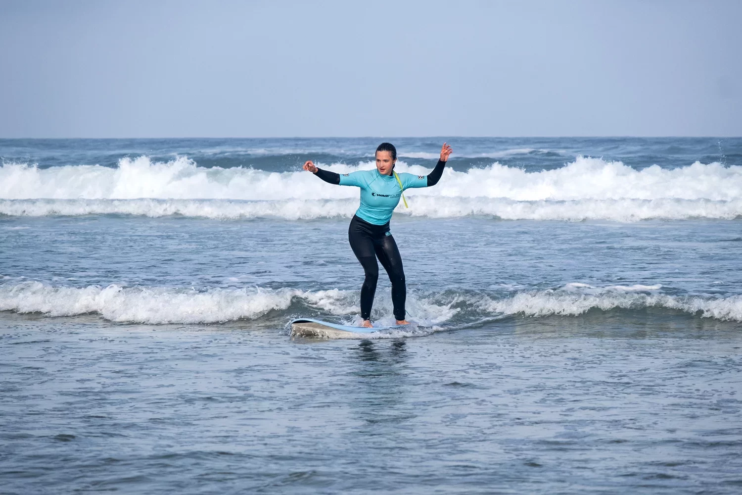 Ob du das erste Mal auf dem Brett stehst oder deine Technik verbessern willst – bei uns findest du den passenden Surfkurs. Jeder Kurs besteht aus 5 x 90 Minuten Surfzeit, ergänzt durch 2,5 Stunden Theorie rund um Wellenkunde, Sicherheit und Material. Dein Coaching beinhaltet Warm-up, Trockenübungen, Theorieeinheiten und natürlich das gesamte Material für die Kurszeit. Du bekommst also alles, was du brauchst, um sicher, motiviert und mit Spaß ins Wasser zu starten.