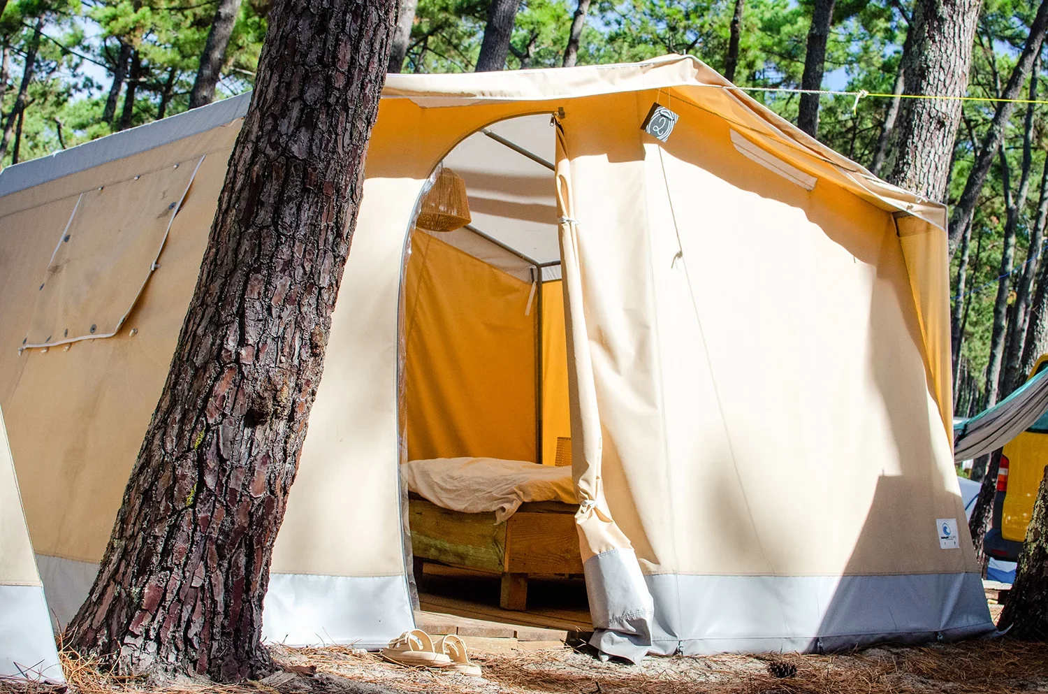 Unsere Zelte stehen auf stabilen Holzböden und sind mit allem ausgestattet, was du brauchst, um dich rundum wohlzufühlen: bequeme Betten (je nach Verfügbarkeit Doppelbett oder 2 Einzelbetten), Licht und Stromanschluss. Hier kannst du dich zurückziehen, gut schlafen und bist trotzdem mitten im Campgeschehen.
