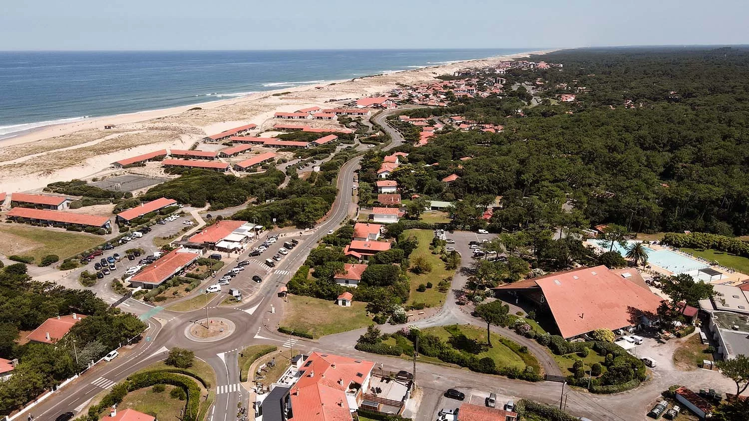 Dein Zuhause am Meer: Im Surfcamp wohnst du in komfortablen Bungalows der Anlage „Club Belambra – Les Estagnots Mer“ – direkt hinter der Düne, nur wenige Schritte vom Atlantik entfernt. Perfekt für alle, die nach dem Surfen mit Freunden relaxen und die Sommerabende draußen genießen wollen.