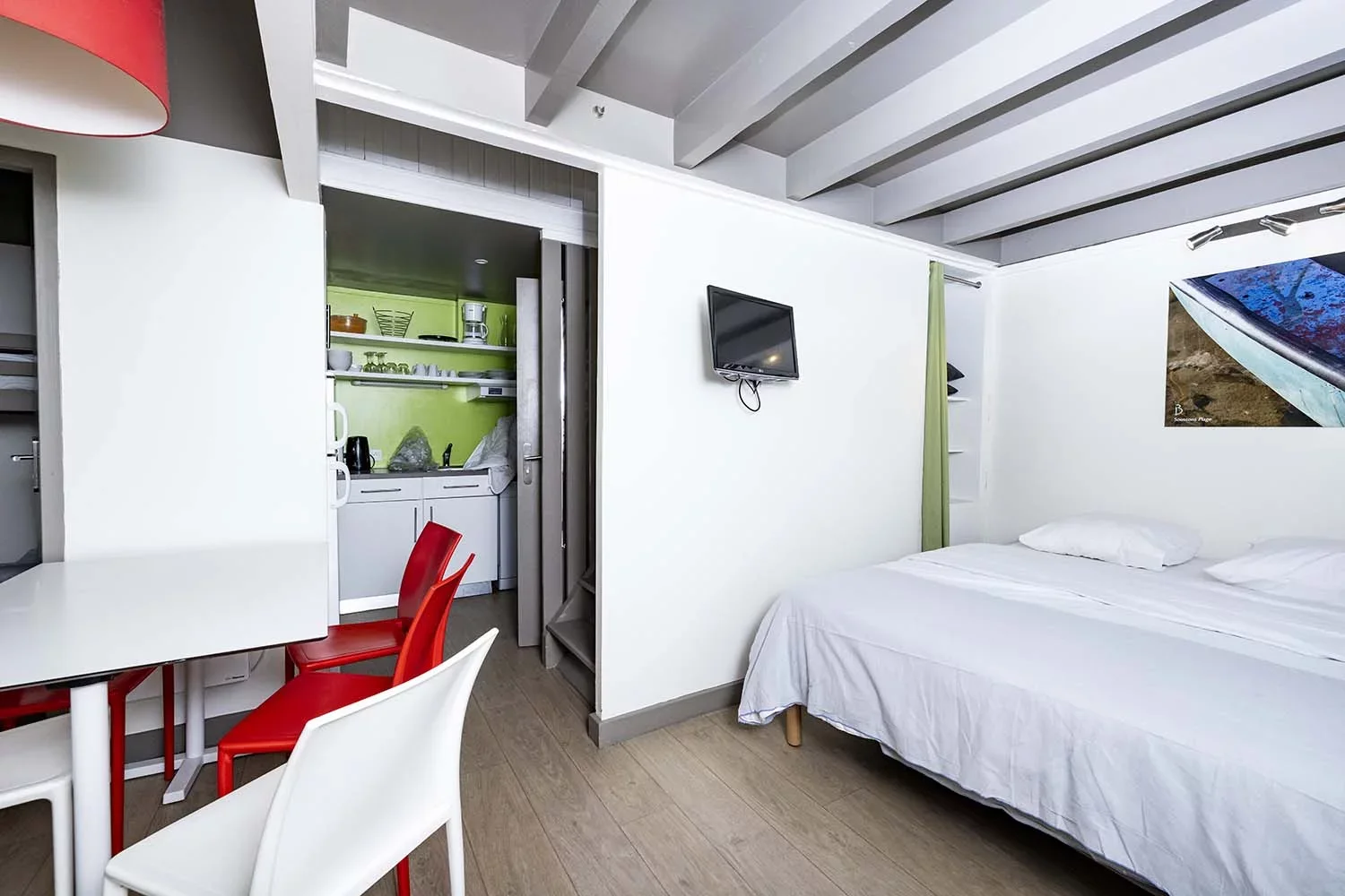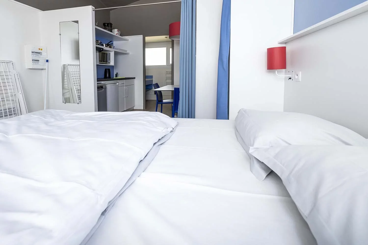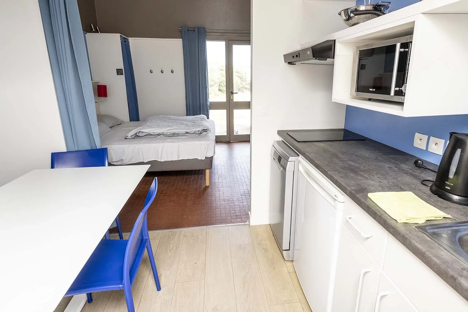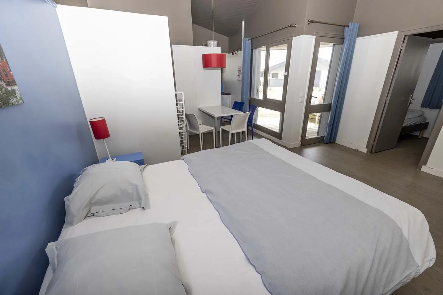 Diese Studios hinter der Düne haben einen Wohnraum mit integrierter Küche und ein Doppelbett – perfekt für zwei Freunde oder ein Pärchen, die sich etwas mehr Privatsphäre wünschen!
