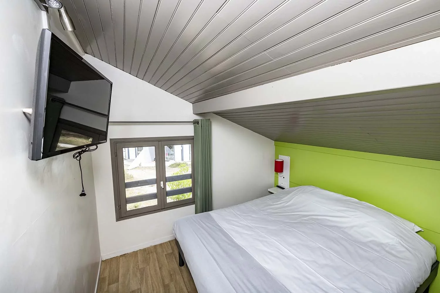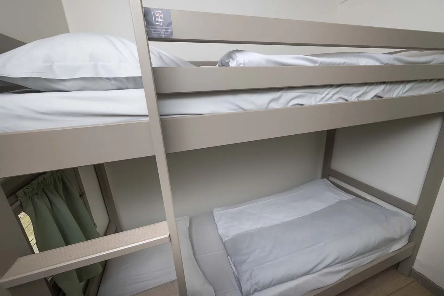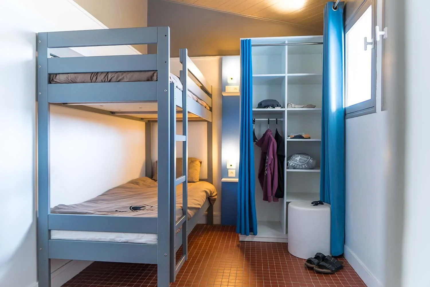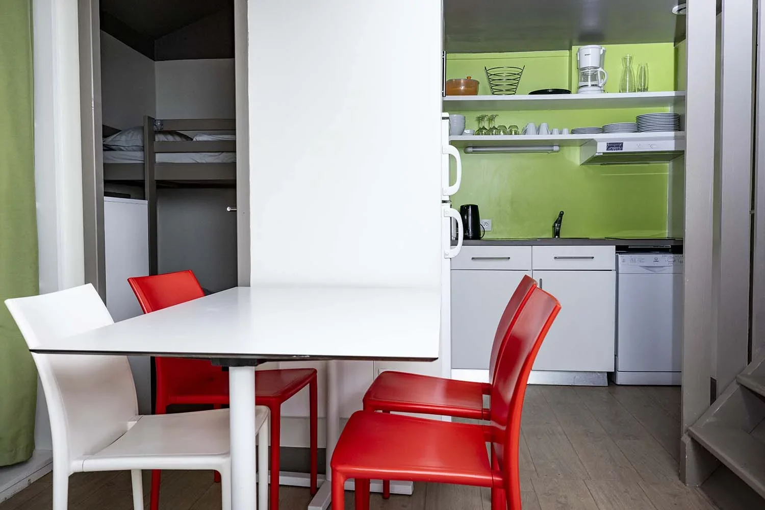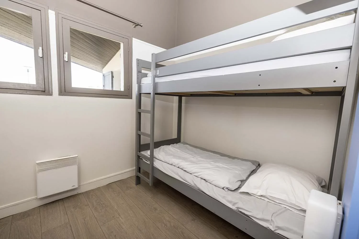 Die zweistöckigen Bungalows (35 m²) umfassen drei Zimmer: ein Wohnzimmer, ein Schlafzimmer mit Doppelbett und ein weiteres Zimmer mit einem Stockbett.