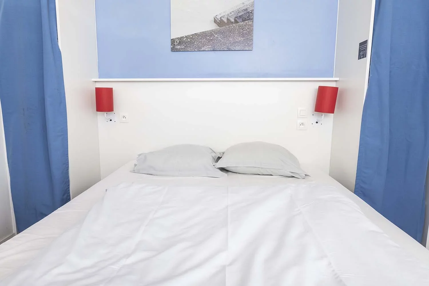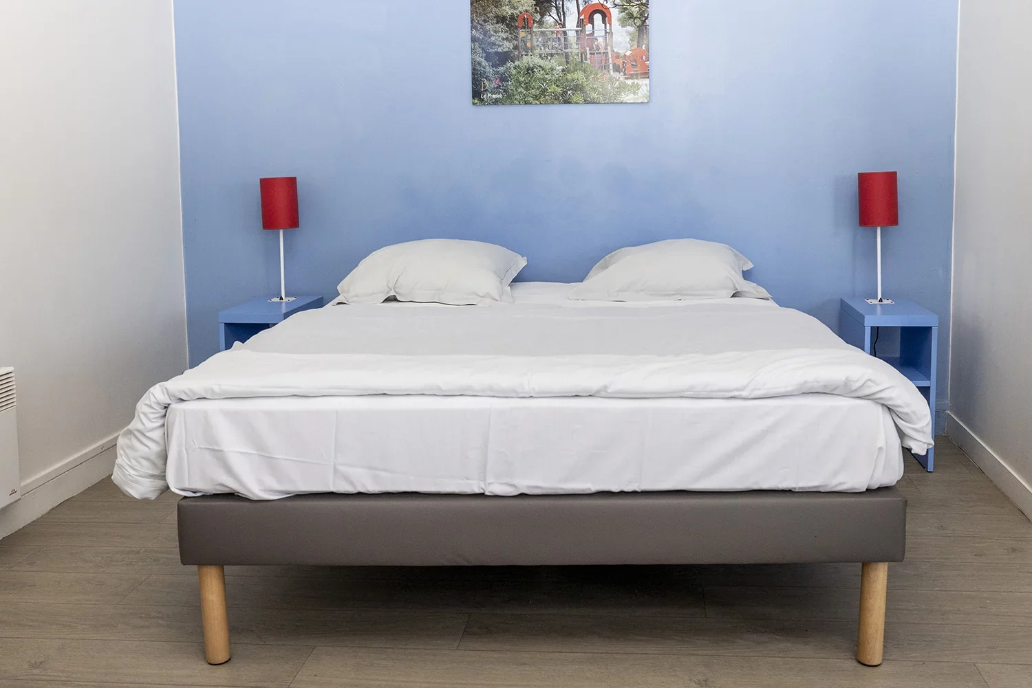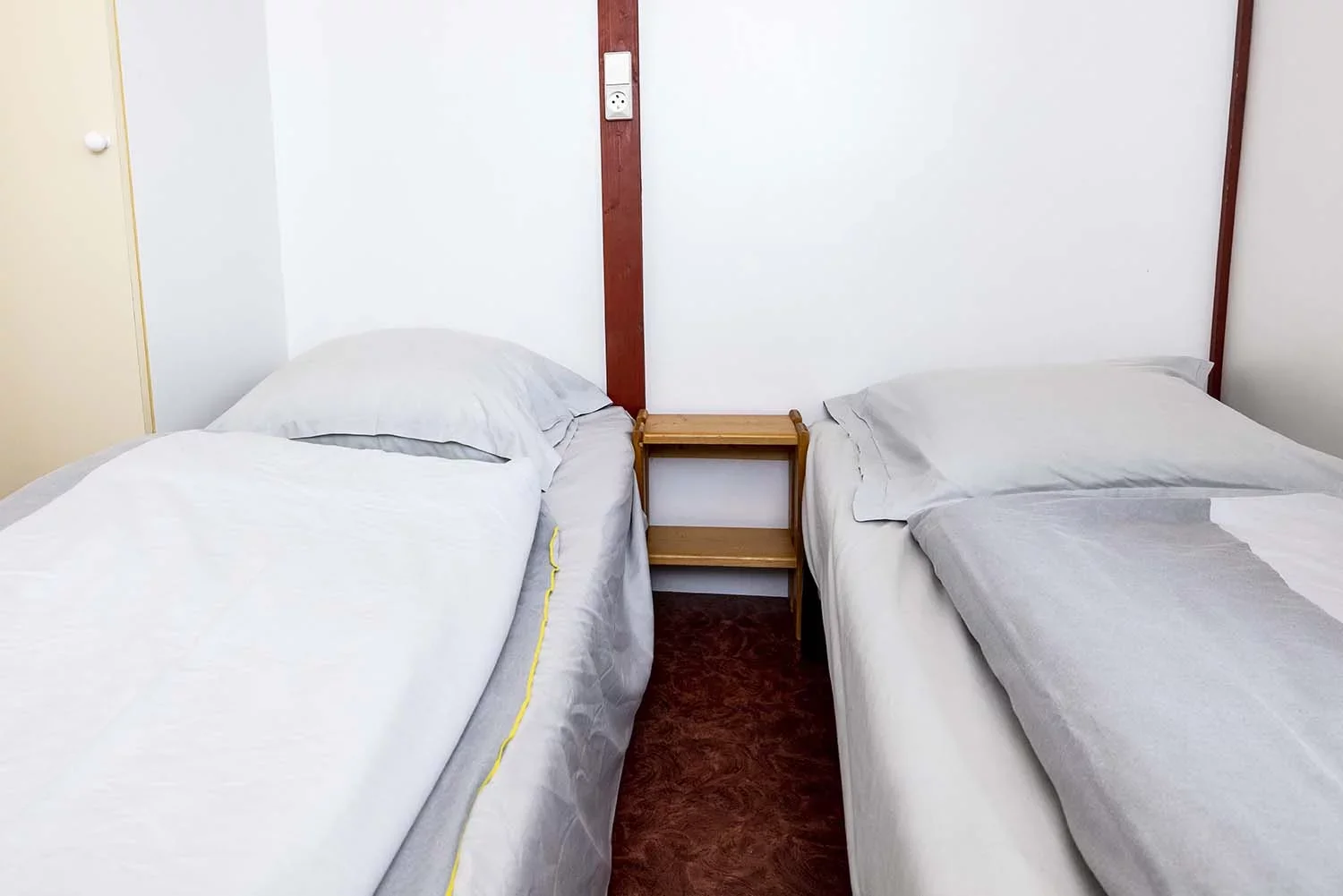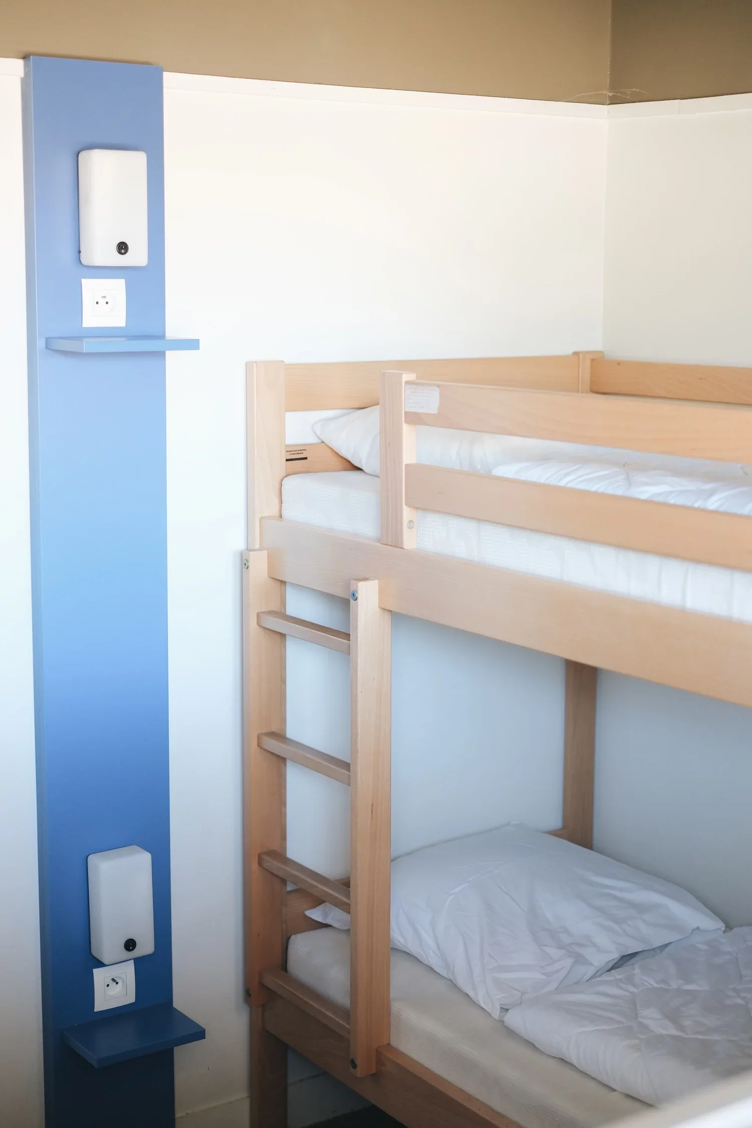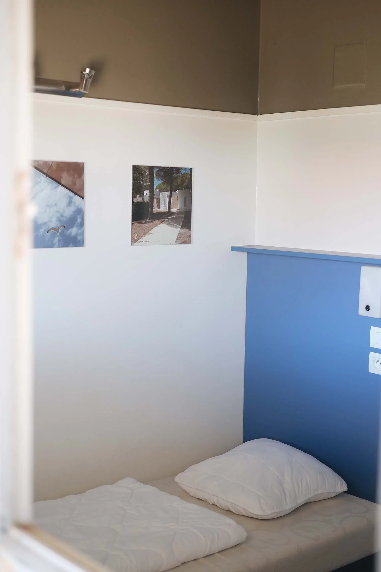 Die zweistöckigen Bungalows (35 m²) umfassen drei Zimmer: ein Wohnzimmer, ein Schlafzimmer mit Doppelbett und ein weiteres Zimmer mit einem Stockbett.