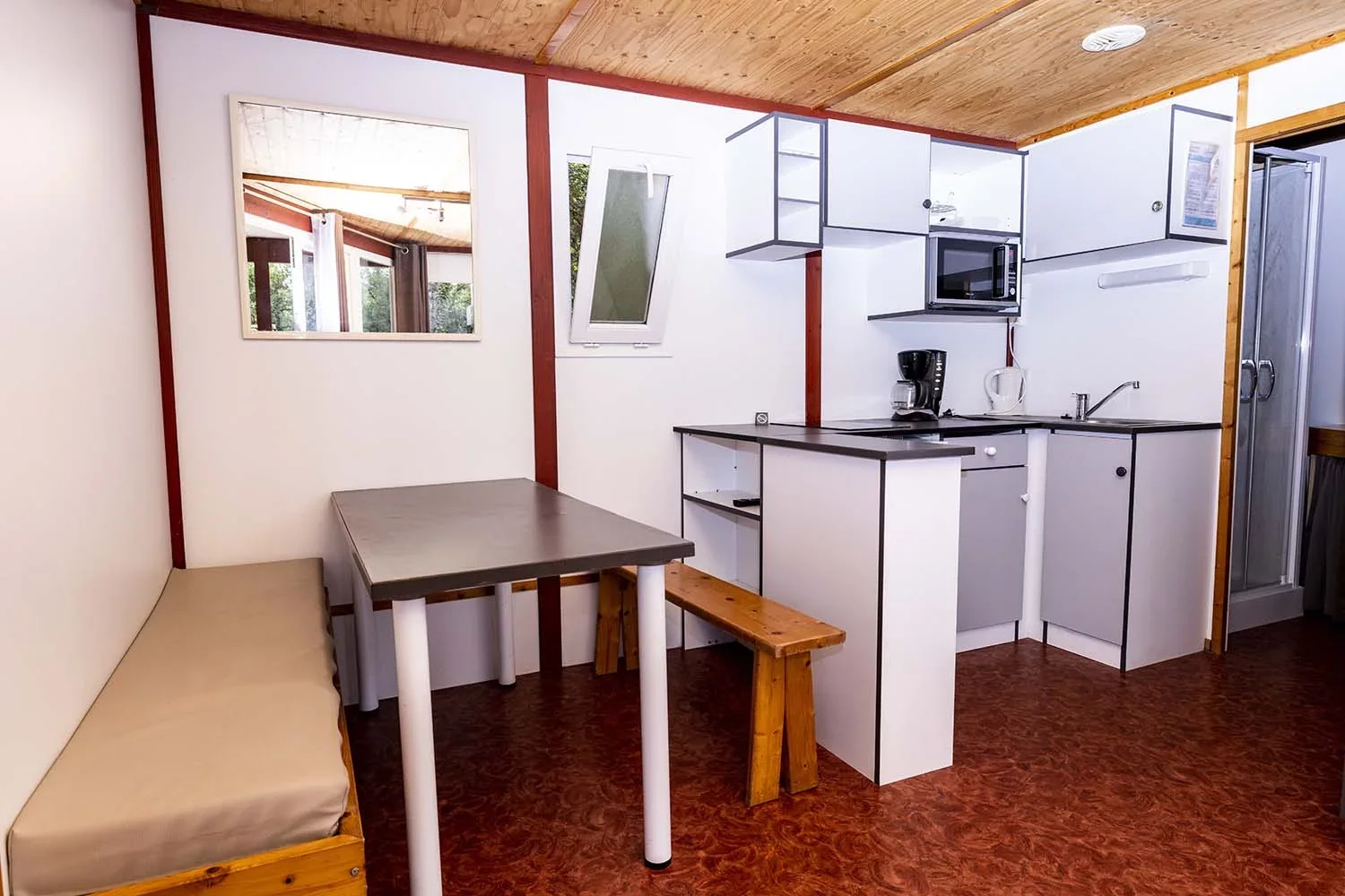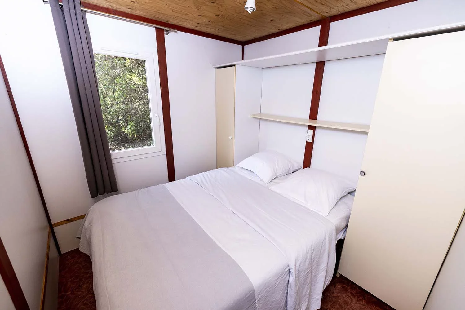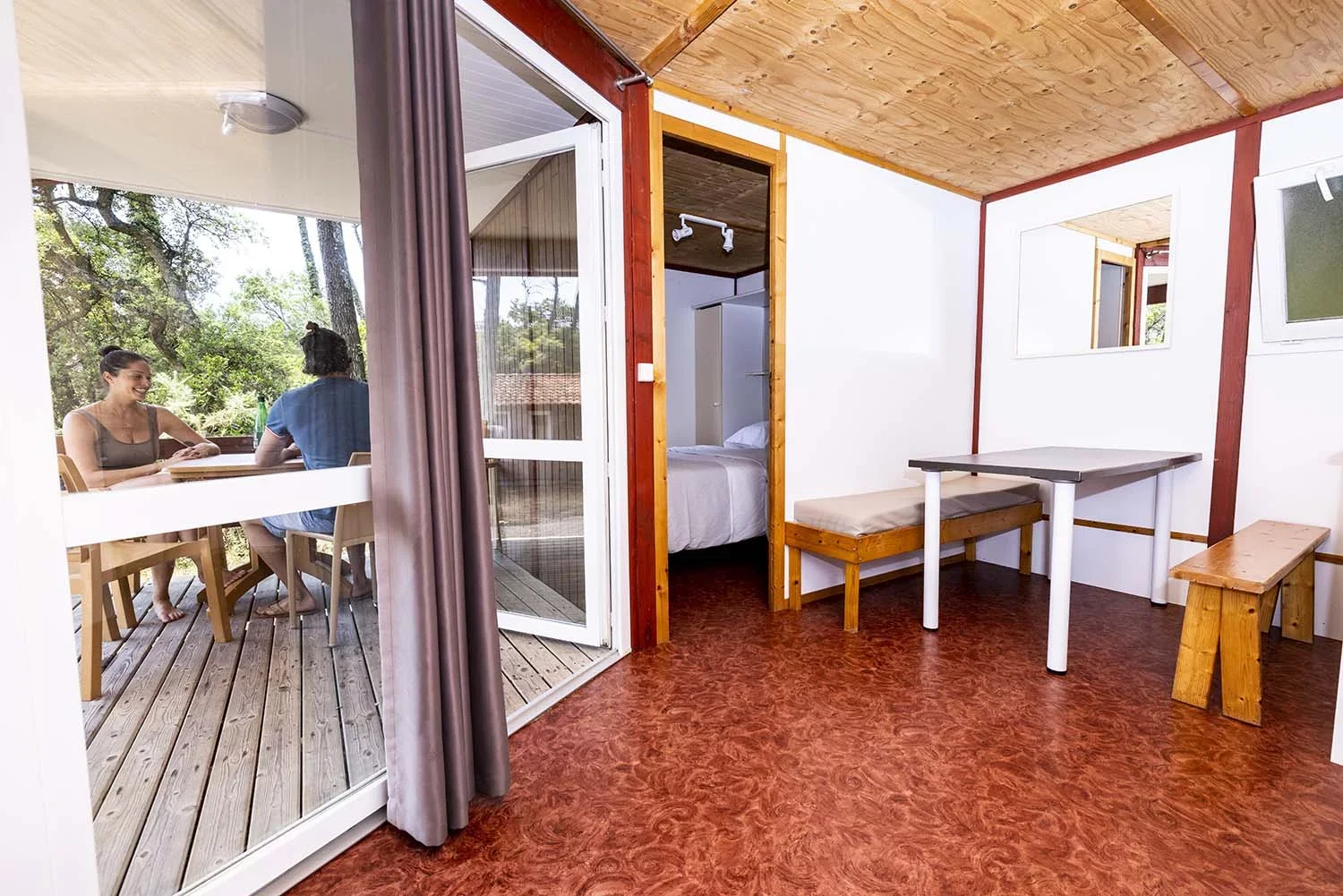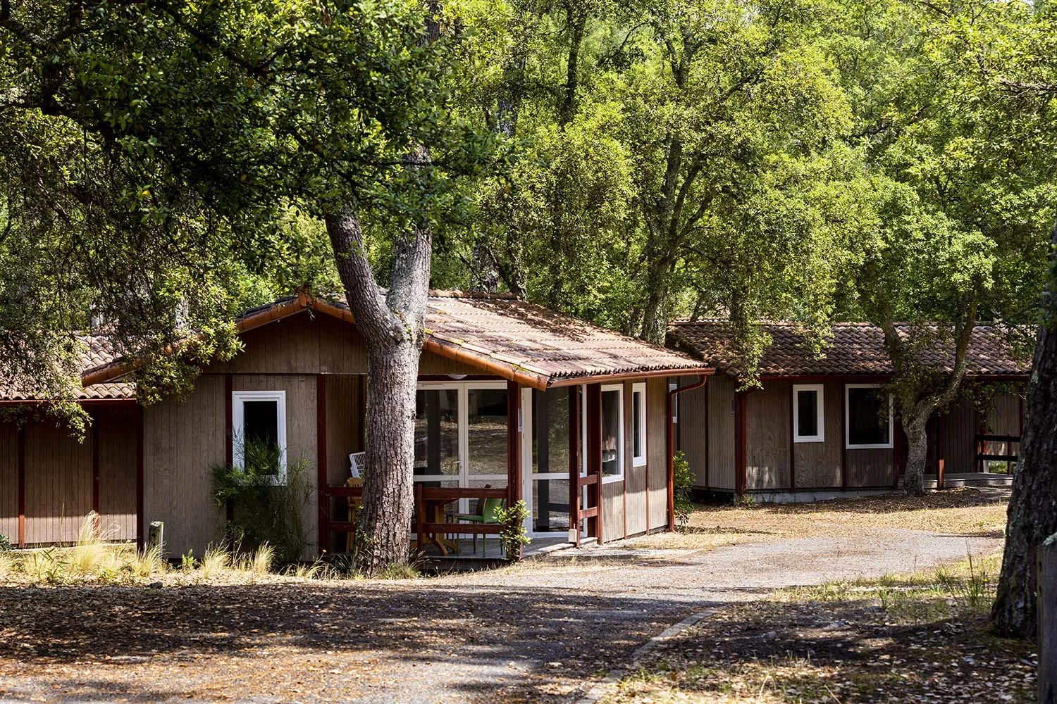 Mit 2 Schlafzimmern (eines mit Doppelbett, eines mit zwei Einzelbetten) bieten diese Chalets im Pinienwald den idealen Rückzugsort.